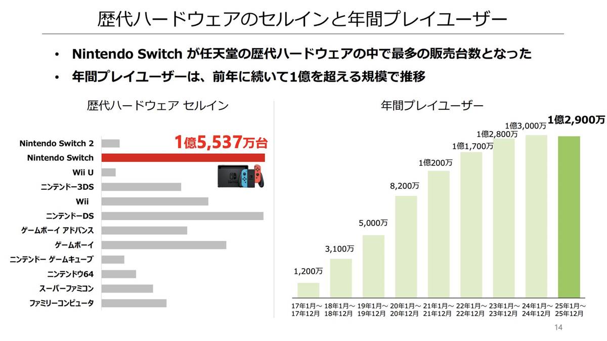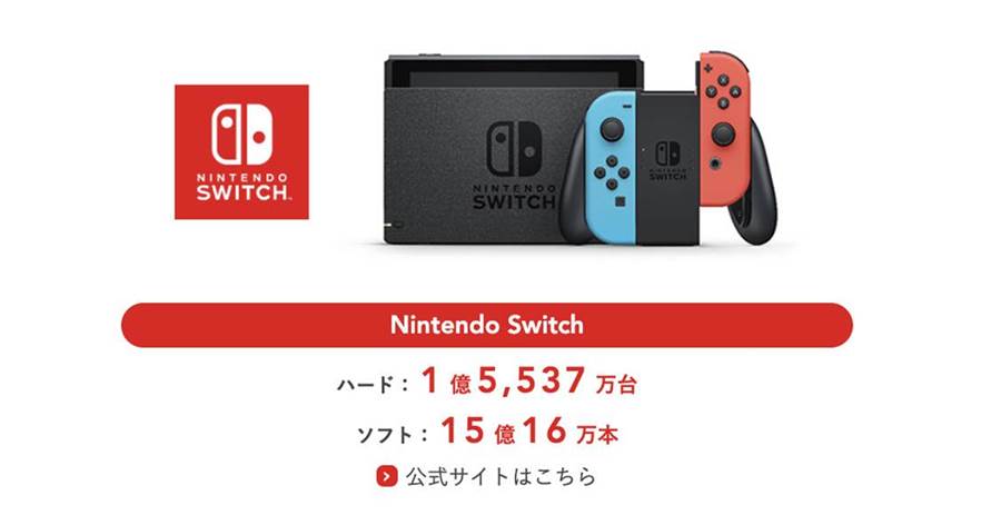 任天堂公布財報資料,指出截至 2025 年 12 月底,Nintendo Switch 全球累計銷售台數已達 1 億 5537 萬台。此數字正式超越過去任天堂歷代主機中銷量最高的 Nintendo DS(1 億 5,402 萬台),使 Nintendo Switch 成為任天堂史上銷量最高的遊戲主機。