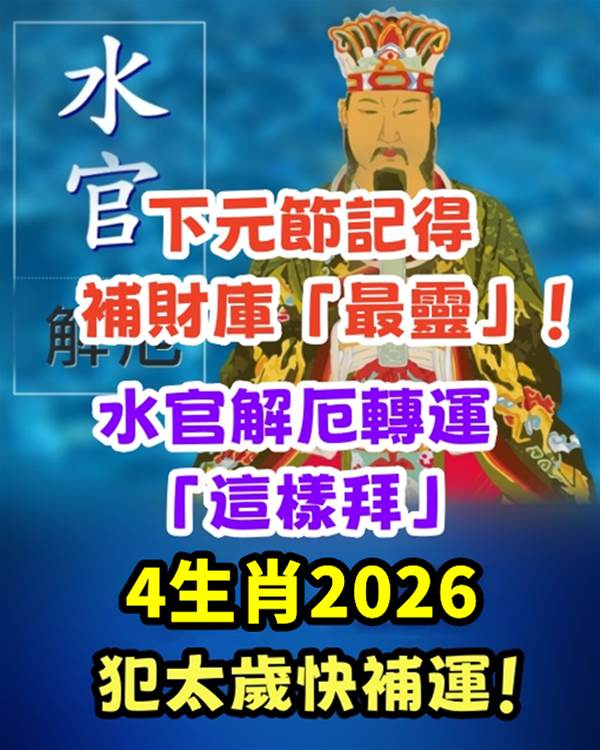 民俗專家表示,農曆十月十五,是「三界公」的水官誕辰日,水官主掌為人們解厄,且掌管財庫,在這天補財庫特別靈驗!尤其2026年犯太歲的4個生肖,建議從下元節開始為明年補運,提早備足能量,消災解厄。