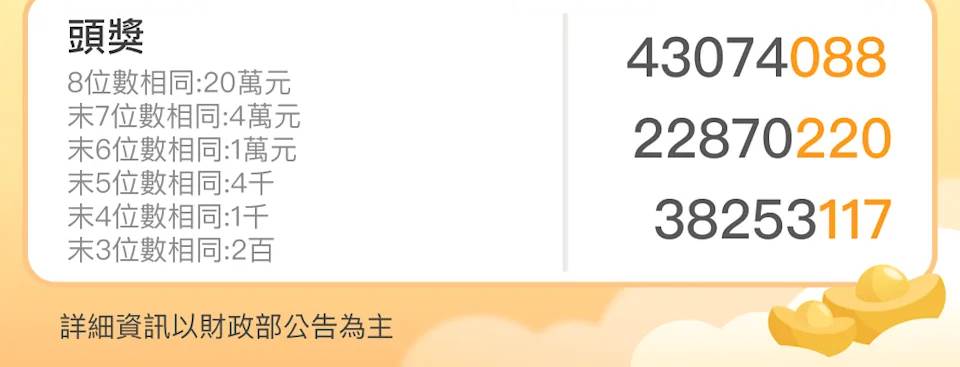 114 年 7–8 月統一發票中獎號碼于今(25)日正式公布。本期千萬特別獎號碼為「53960536」,200 萬元特獎號碼為「51509866」,三組 20 萬元頭獎分別為「43074088」、「22870220」、「38253117」。民眾可自10月6日起至 2026年1月5日止兌領獎金。
