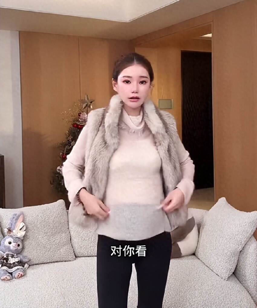 影片中她穿了一件毛茸茸的裙子,下身是一條比較修身的褲子,她表示腹部是可以「藏」起來的。