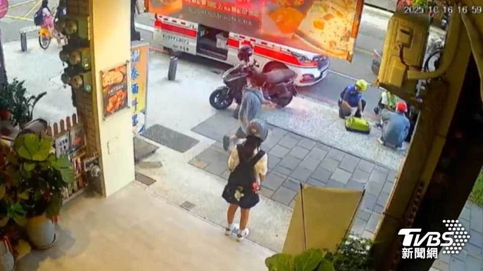 黑衣女子穿越斑馬線,突然被車子撞飛,好大的「砰」一聲,透過監視器可以看到,女子虛弱地坐在路邊,許多路過民眾也上前關心。目擊民眾:「我看妹妹原本站在那邊,然後她走出來的時候貨車就來了,然後(撞)上去之後,妹妹飛到差不多那個位置。」目擊店家業者:「飛到兩個店面那邊,就坐在那邊,事後是我們附近店家,他們有請救護車來。」