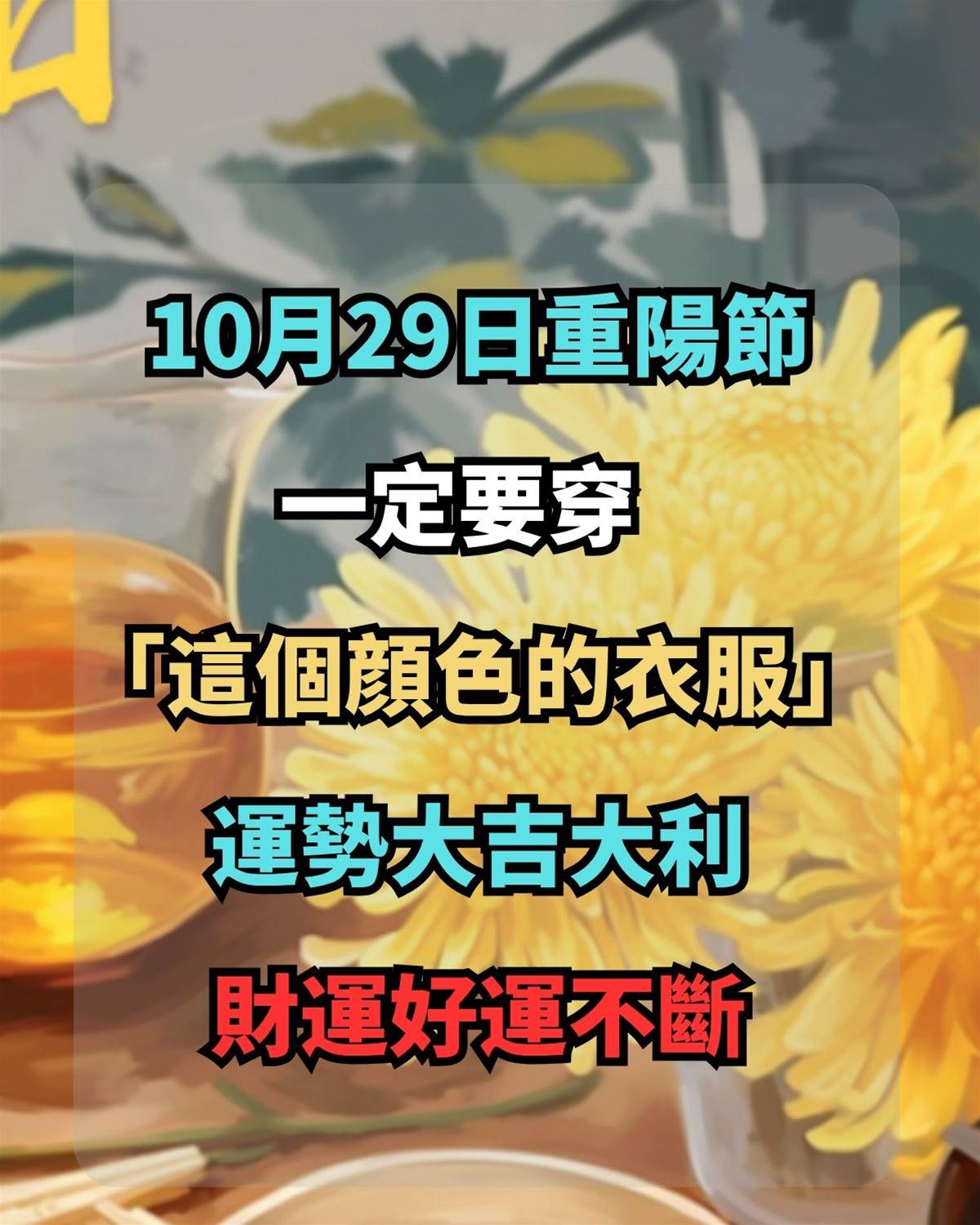 10月29日重陽節不只要登高賞菊,更要「穿對顔色」!命理師獨家揭秘:重陽節是「陽氣最頂」的日子,穿對顔色可旺全年運勢,財運、好運不斷!10秒看懂「旺運顔色」與穿搭技巧,讓你從頭旺到尾!