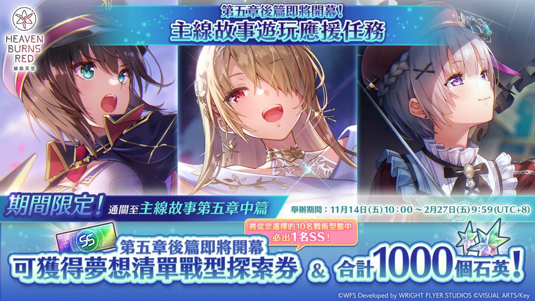 主線故事第五章開幕前,遊戲將于 2025 年 11 月 14 日(五)10:00 起舉辦可獲得第五章後篇即將開幕夢想清單戰型探索券和合計 1000 個石英的「主線故事遊玩應援任務」。