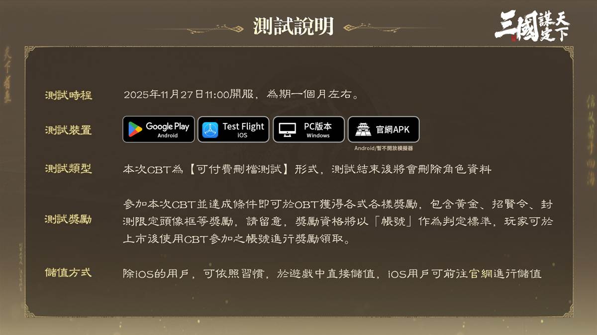 《三國:謀定天下》宣布將于 11 月 27 日(四)正式開啟 CBT「帷幄測試」。官方表示,本次測試將採取「可付費刪檔」形式進行,並開放第一賽季內容,玩家可于 11 月 25 日(二) 起搶先進行預下載,提前整軍備戰,為即將展開的謀略大戰做足準備。