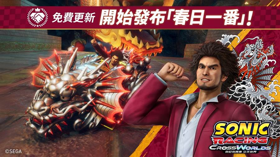 SEGA 世雅宣布,販售中的《索尼克賽車 交叉世界》已自 11 月 6 日(四)起發布免費更新「春日一番(《人中之龍》)」,並預定于 11 月 7 日(五)起舉辦期間限定的合作賽事「春日一番祭典」。于賽事期間收集祭典點數,即可獲得合作賽事獨有的特別遊戲道具。