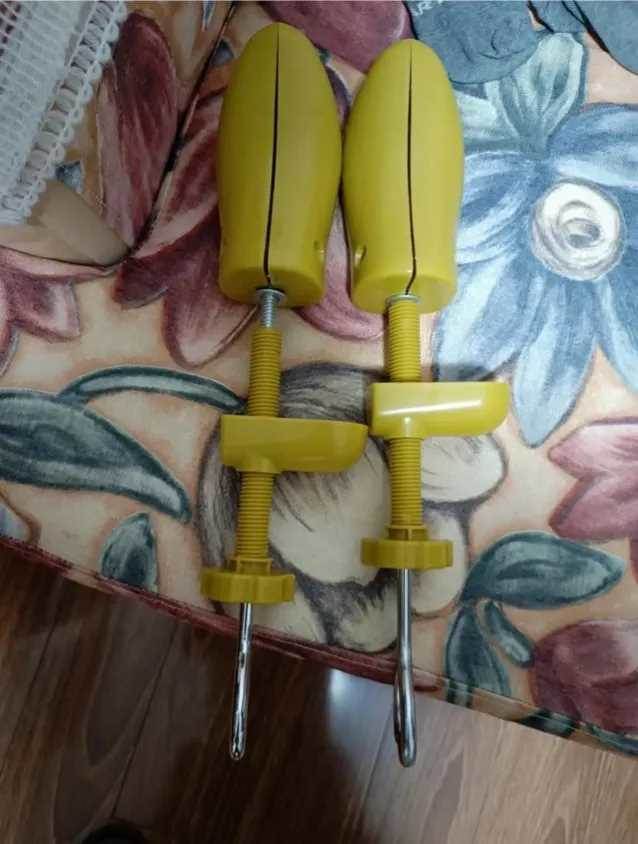 它們並排放在印有藍紫色花朵的布墊上,形狀像葫蘆,中間有一圈閃亮的銀色調節環,下面延伸出細長的金屬桿,末端還帶著小鉤子。