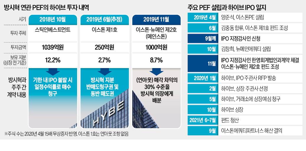 方會長在2020年10月HYBE(當時為Big Hit娛樂)上市前,先后與Stick投資、Eastone股權合伙公司(Eastone PE)、Newmain股權等簽訂股東協議。根據協議,方會長將獲得這些PEF在IPO后出售差價的30%,若未按期上市則由個人回購股份。