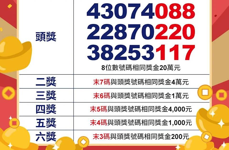 同期統一發票收執聯8位數號碼與頭獎號碼相同者獎金20萬元。