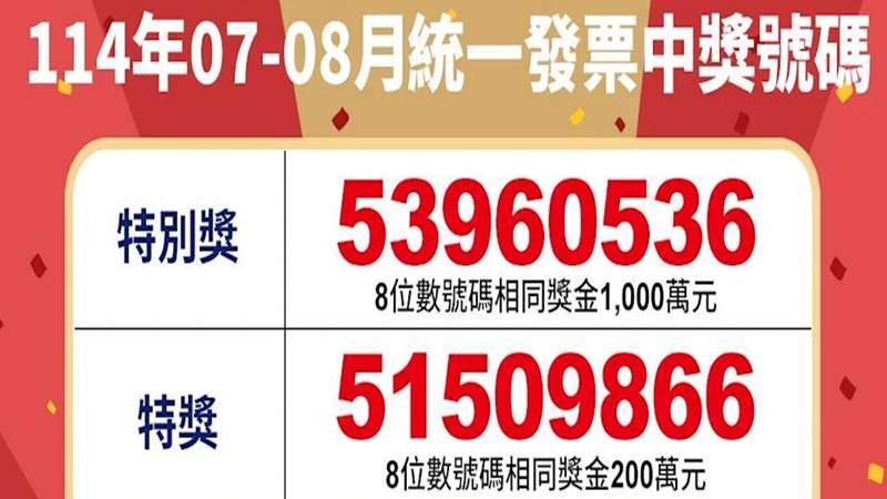 114年7-8月統一發票中獎號碼今(25)日開獎,特別獎「53960536」及特獎「51509866」,頭獎3組號碼分別為「43074088」、「22870220」、「38253117」。財政部賦稅署提醒,114年7-8月期統一發票中獎領獎期間為114年10月6日至115年1月5日。