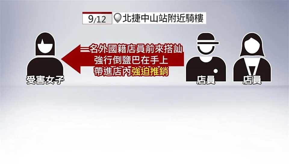 受害女子當時在北市中山區一帶被兩名店員搭訕,還強行倒鹽巴在她手上,接著被帶進店內消費,原以為7樣商品9千多元,但刷卡後看到簽單才知道是「9萬多元」,女子當下要求退款被強硬拒絕。