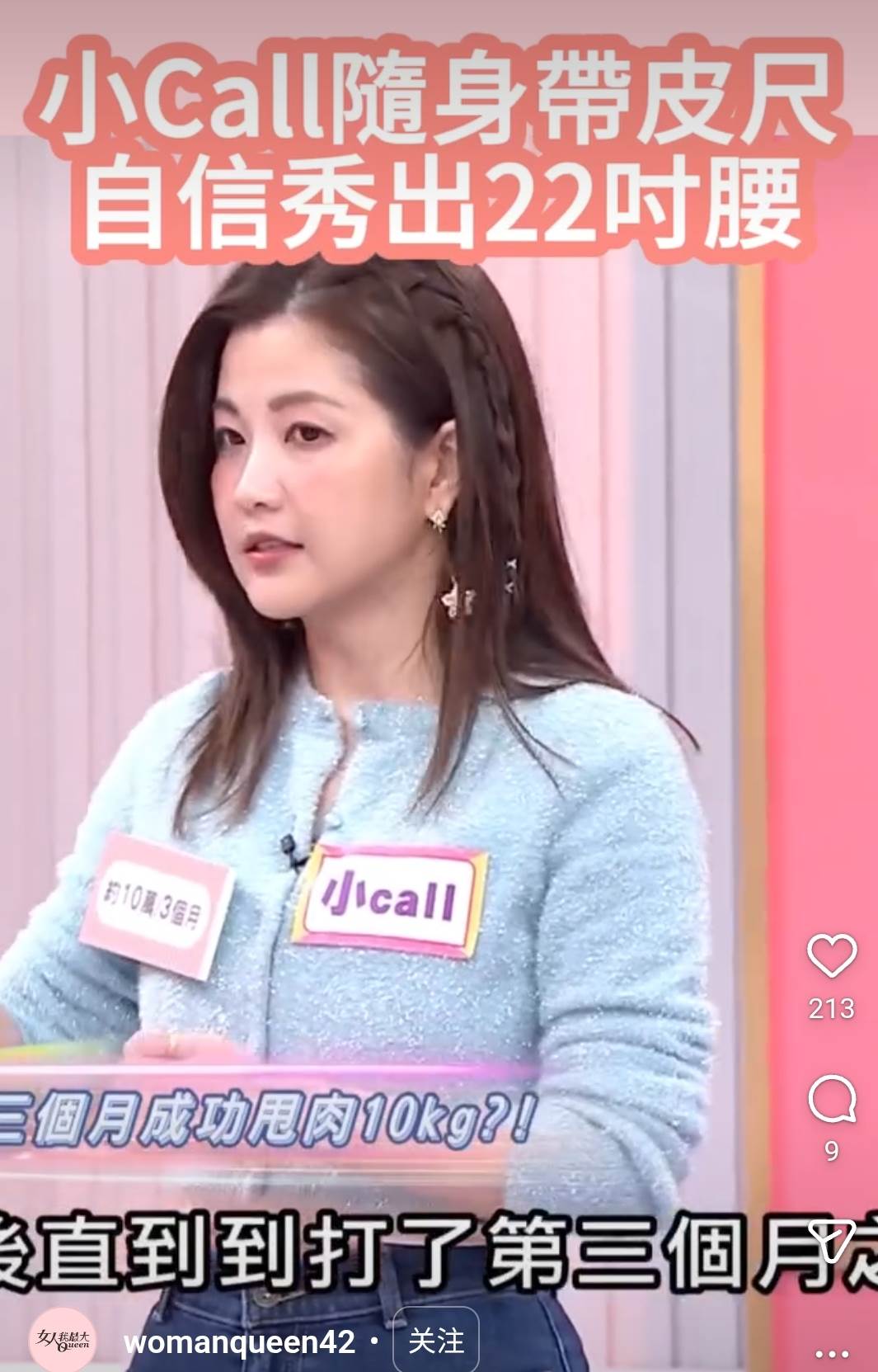 女藝人小Call(郭怡伶)日前登上《女人我最大》節目,大方分享自己3個月甩肉10KG的瘦身歷程,還隨身帶皮尺量給大家看,22吋腰線直接驚呆全場。