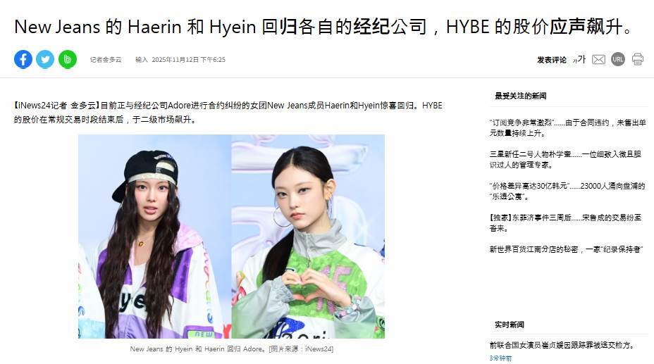 據采訪結果,Haerin與Hyein早在官方發布約一周前,就已向ADOR表達了回歸意向,并與公司進行了意見協調。之所以選擇在12日正式公布,是因為次日13日正好是「專屬合約有效性確認訴訟」的上訴截止日。據悉,ADOR在與Haerin、Hyein溝通的過程中,也一直等到這一天,希望剩下的成員能通過是否上訴的決定,正式表明立場。