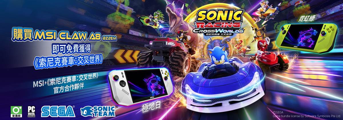 微星與 SEGA 隆重宣布合作,為遊戲玩家帶來非凡的競速體驗。 2025 年 10 月 2 日至 10 月 31 日,凡購買符合資格的 MSI Claw A8 電競掌機,即可免費兌換最新上市的《索尼克賽車 交叉世界》遊戲(市價 NT$1,990)!