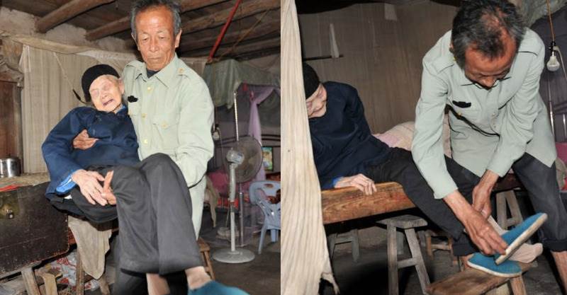 71歲的女婿曾科輕輕抱起102歲的岳母到桌邊吃飯,僅這個動作,曾科就堅持了34年,每天如此。