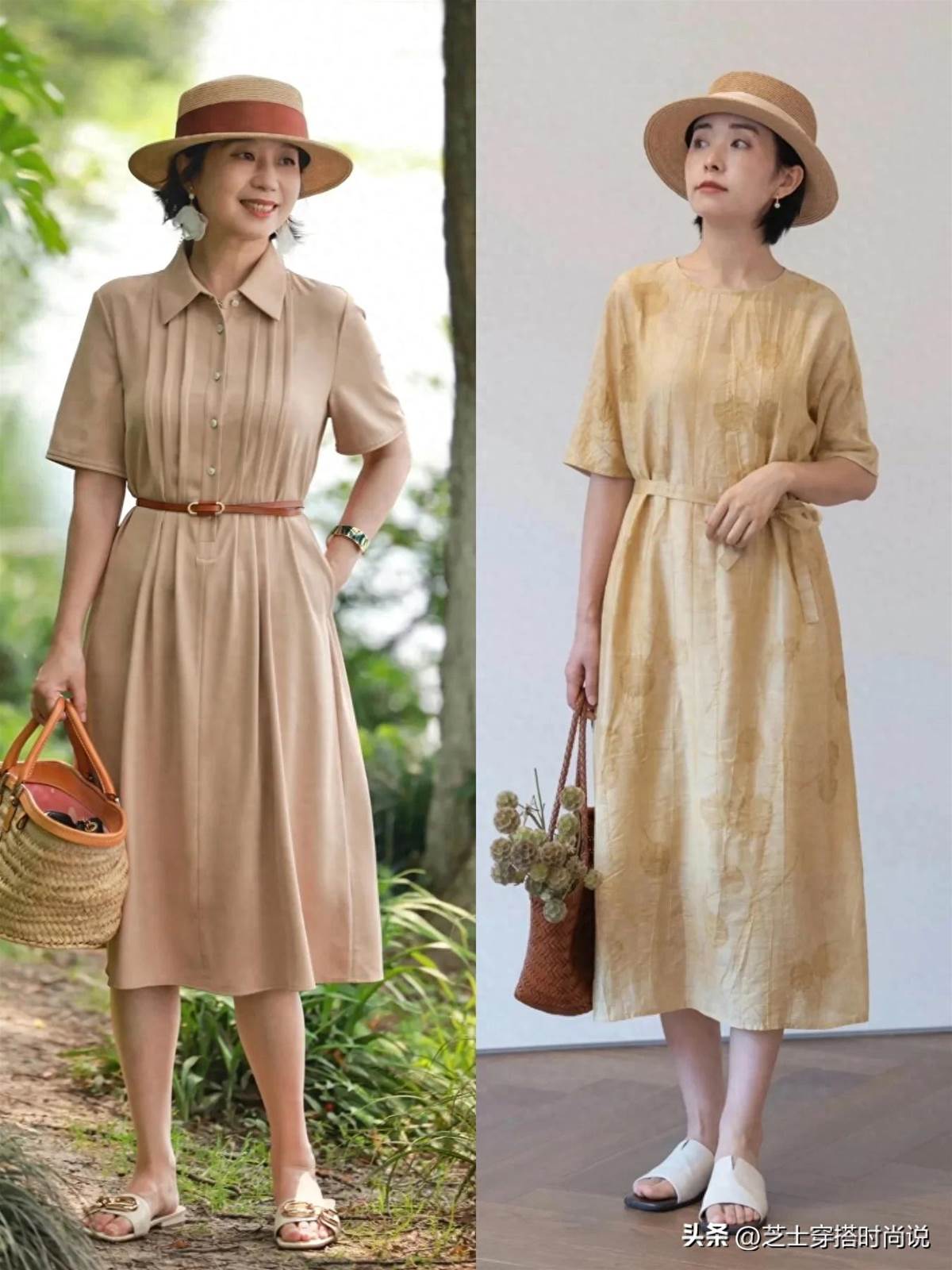 奶茶色的連衣裙自帶溫柔氣質感,比白色高級,比黑色洋氣,能很好地襯托中年女性端莊優雅的韻味。