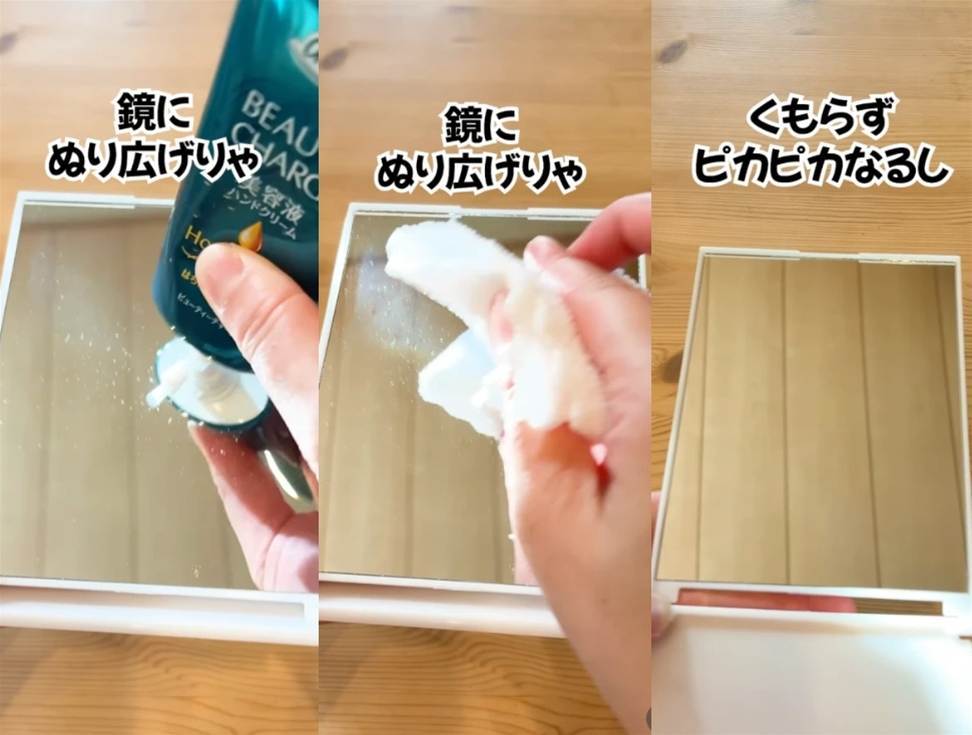 隨身鏡常因指紋、灰塵變得霧霧的,臨時沒有清潔用品時,可以擠一點護手霜在鏡面上,再用面紙或乾布輕輕擦拭,就能帶走油污與髒汙,讓鏡面恢復清晰。