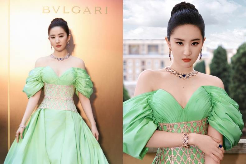 劉亦菲日前出席精品品牌寶格麗活動,以一襲綠色深V禮服登場,好身材嶄露無遺,