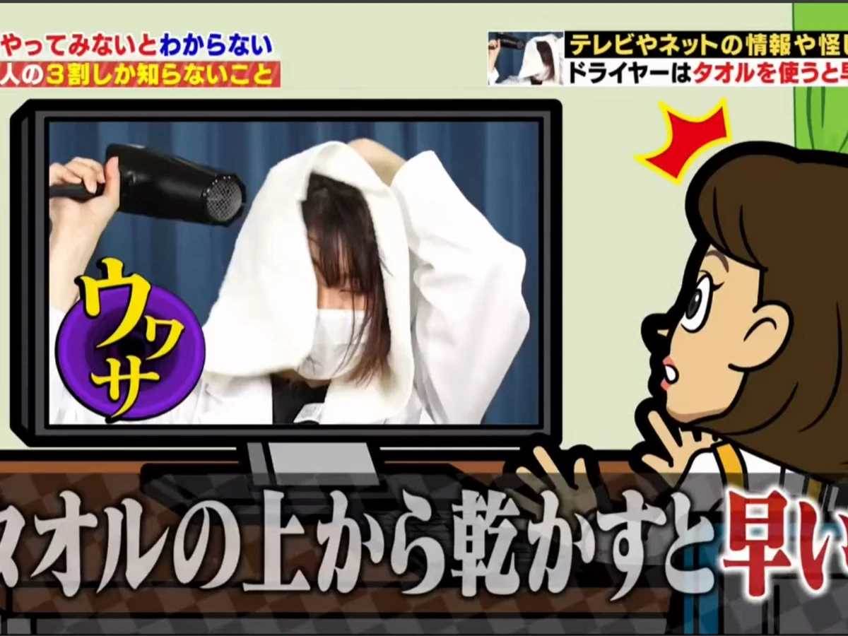 吹頭髮總是要花上好幾分鐘嗎?日本朝日電視台節目《くりぃむしちゅーのハナタカ》近日實測一個網傳「快速乾髮術」,據說只要在濕髮上蓋條毛巾再用風筒吹乾,就能大幅縮短時間。