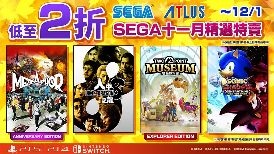 世雅股份有限公司現正舉辦「SEGA 十一月精選特賣」活動,針對 PlayStation Store 及 Nintendo eShop 所販售的部分 PlayStation 5/PlayStation 4/Nintendo Switch 進行遊戲作品限時特價。