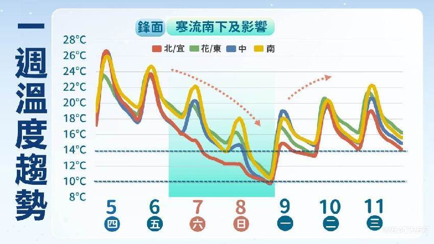 今天(6日)鋒面貫通,北部、宜蘭及花蓮有短時降雨,週六、台東、恆春中部和中部為區域性短雨,夜間高溫稍驟升至最低21度、最高29度。