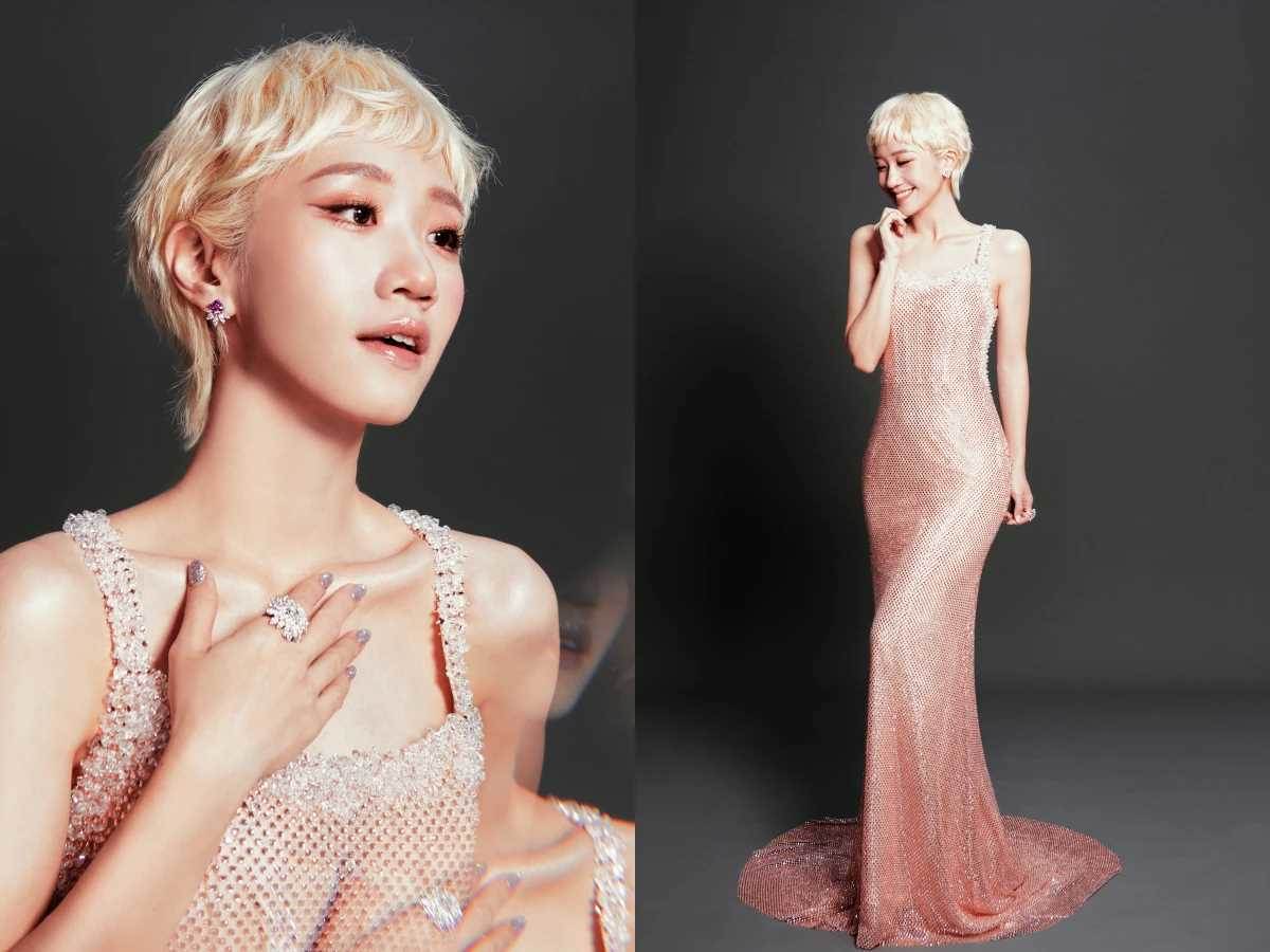 今晚以華麗禮服現身紅毯,合身的淡粉色大挖背連身魚尾裙,搭配上千萬珠寶氣場全開,膚色透亮、整個人自信又有光澤。