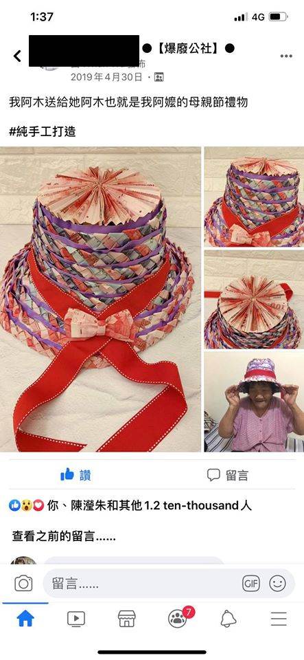 有網友在臉書社團「爆廢公社」發文說,去年的母親節,媽媽為了給阿嬤一個難忘的驚喜,特地用各種顏色的鈔票,獨家打造一頂「現金帽」,送給對方當母親節禮物,讓阿嬤實在是笑得合不攏嘴,除了很有孝心外,也相當有創意,吸引超過萬人網友點讚。