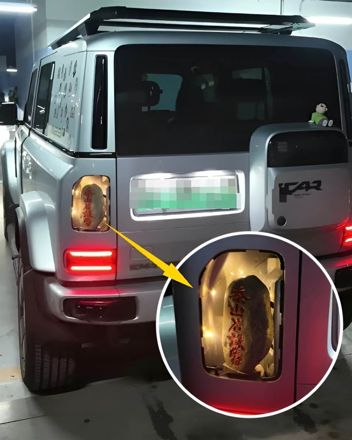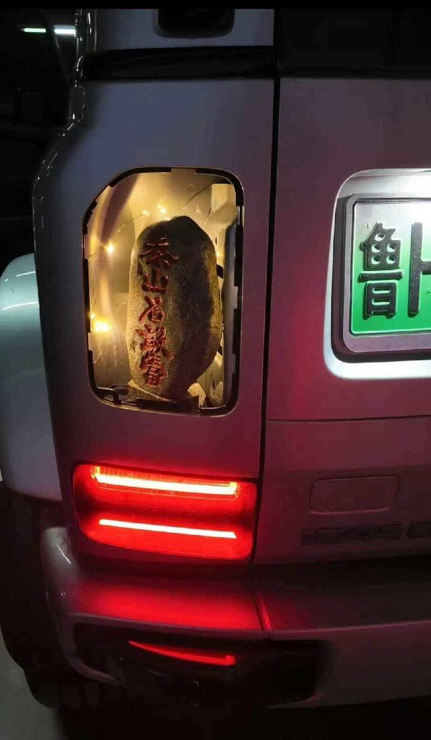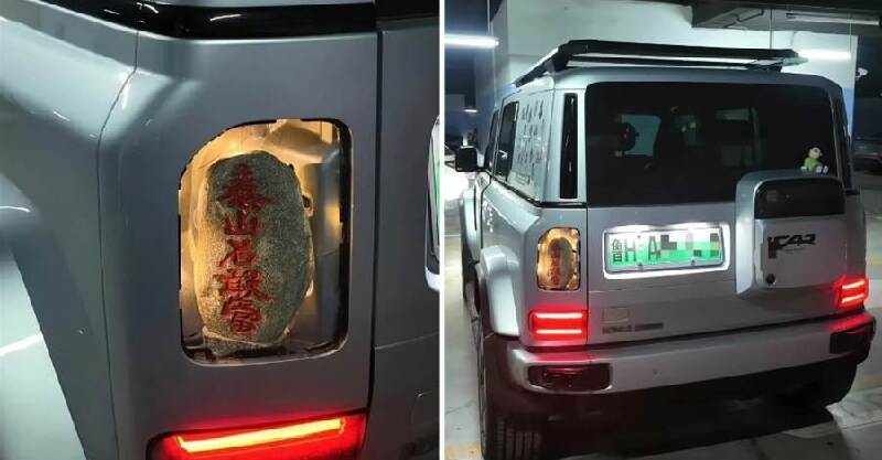 近日,一位司機在開車途中遇到了一輛特別的車,這輛車的尾部內嵌了一塊刻有字的石頭,讓他感到非常新奇,于是他將這一幕分享到了網上。