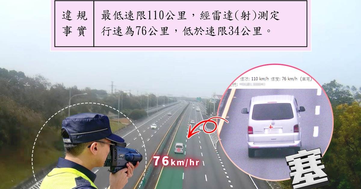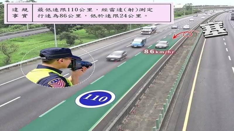 國道警察局近日在臉書粉專上發文「不取締對得起大家嗎?」並分享一張取締照片,可見有輛轎車行駛在內側車道,但數據顯示該輛轎車的時速僅有86公里,造成後方車流被迫減慢速度,文章曝光後引發熱議,吸引2.5萬名網友按讚,更有人留言大讚「多拍點這種的吧」、「龜速車真的是不要上國道」。