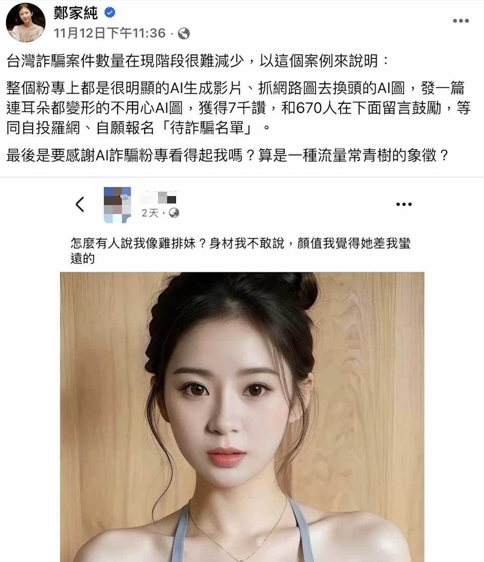 「雞排妹」鄭家純近日在社群平台分享截圖,只見一名網路正妹聲稱自己長得像她,吸引7千多個讚。不過,雞排妹細細分析驚揪是詐騙,傻眼表示:「要感謝AI詐騙粉專看得起我嗎?」