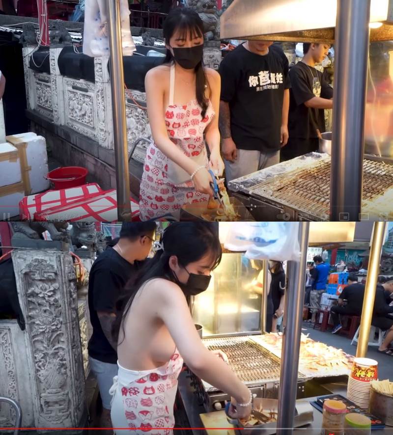 這位正妹店員在士林夜市的烤魷魚攤位忙進忙出,但仔細一看,她上半身光溜溜一絲不掛,只用圍裙遮掩春光,白皙美背也全部外露,照片PO網後,引來網友朝聖大讚,「台灣夜市的魷魚特別香的」、「好久沒一起去夜市了」、「我想吃烤魷魚了」、「天氣熱,我能理解」。