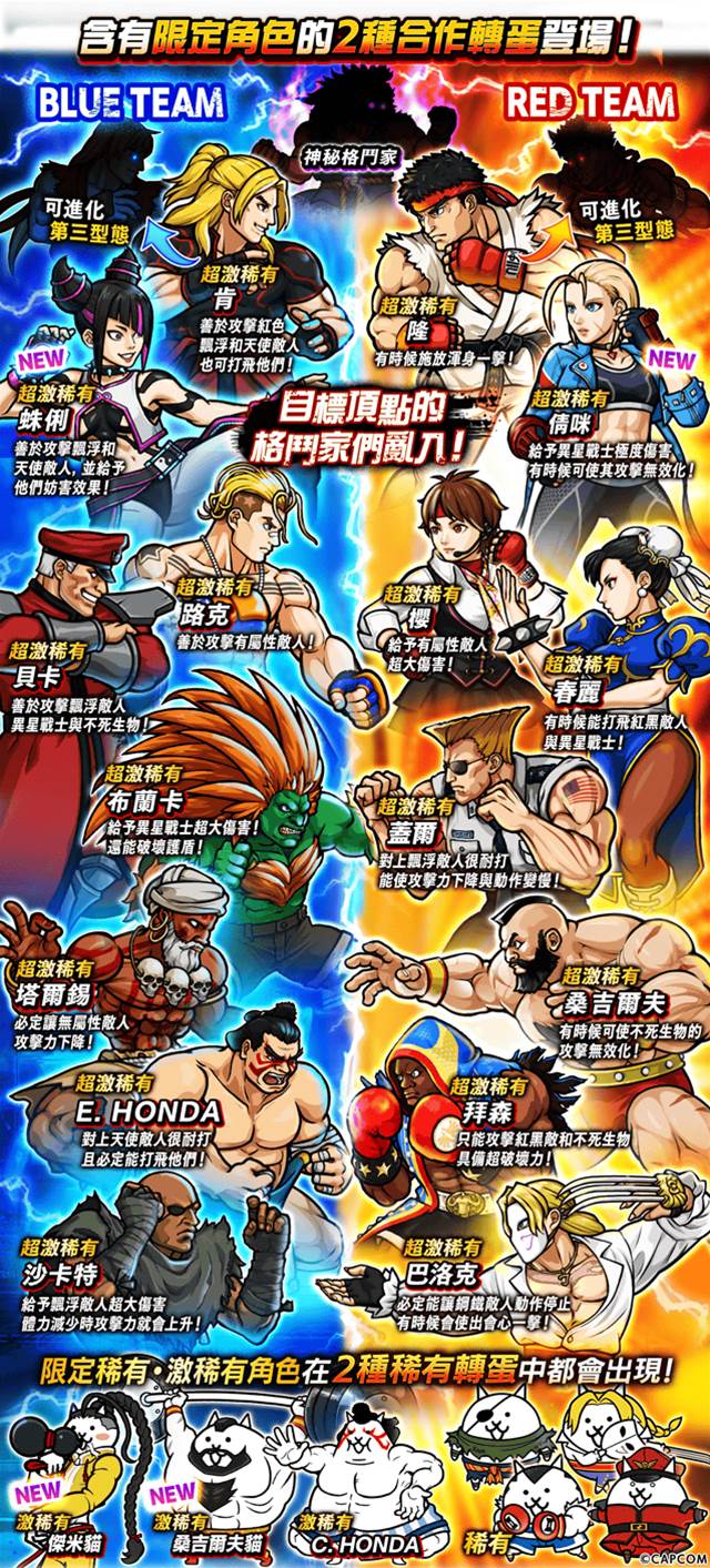 會出現合作限定角色的《快打旋風 6》稀有轉蛋分為 BLUE TEAM 和 RED TEAM 共 2 種!這次追加了全新超激稀有角色「蛛俐」和「倩咪」,以及激稀有角色「桑吉爾夫貓」與「傑米貓」!「蛛俐」會在 BLUE TEAM 轉蛋,「倩咪」則會在 RED TEAM 轉蛋出現!「桑吉爾夫貓」和「傑米貓」則是兩種轉蛋都會登場。