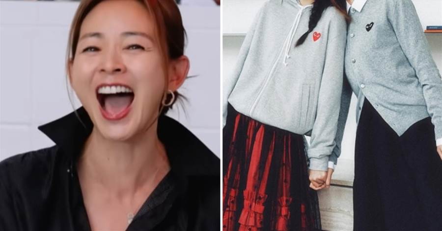 兩人身穿灰色開衫、連帽衛衣以及黑紅配色的百褶裙,打造出簡約卻默契十足的「母女情侶裝」造型。