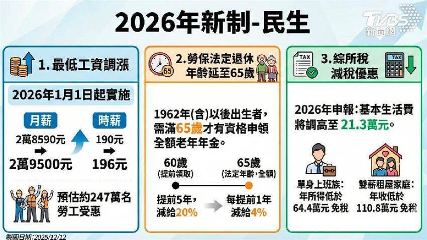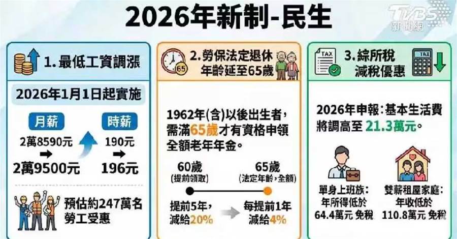 2026年在補貼方面,基本生活費將調高3,000元,自21萬元增加至21.3萬元,202萬戶受益人、減稅12億元。