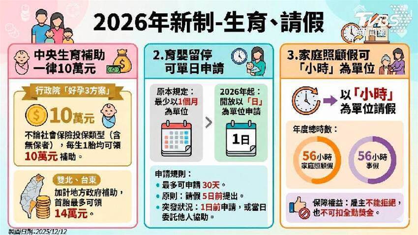 2026年將有試辦新制上路,包括工廠月最低工資調漲至2萬9,500元、時薪196元;鋼筋加強頂樓加蓋、違建等非法建築;育嬰開放以「日」為單位申請申請;廣播機構擬推出5月大平日國旅補助方案、衛福部推出「健康幣期」為「健康幣訓」;「TVBS新聞網」整理2026各項新制,帶您一次了解。