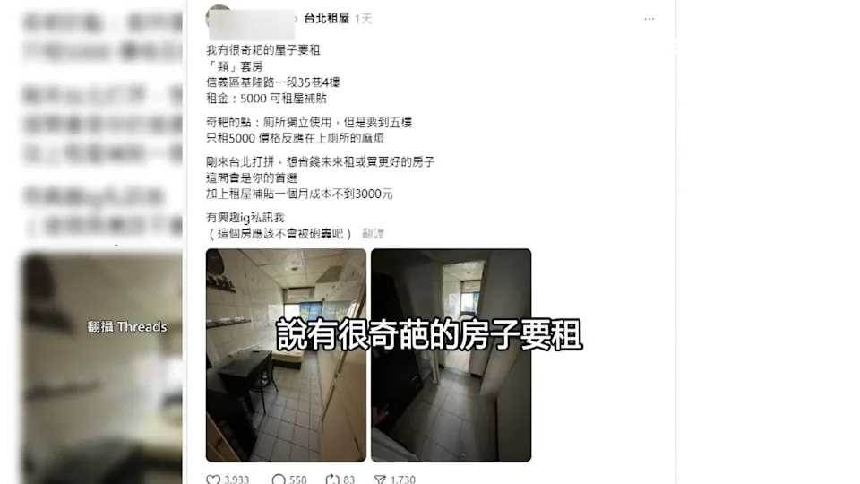 社群軟體上出現一則套房招租貼文,但房東說這間是「類套房」,想上廁所還得爬到5樓去,優點是便宜,雖然在台北市信義區,月租金卻只要5000元,還可以租屋補貼,但不少民眾看到覺得無法接受,萬一上廁所很急怎麼辦?但也有人說以信義區行情來說這真的很便宜,有眼尖網友質疑,這根本是廚房改建成的房間。