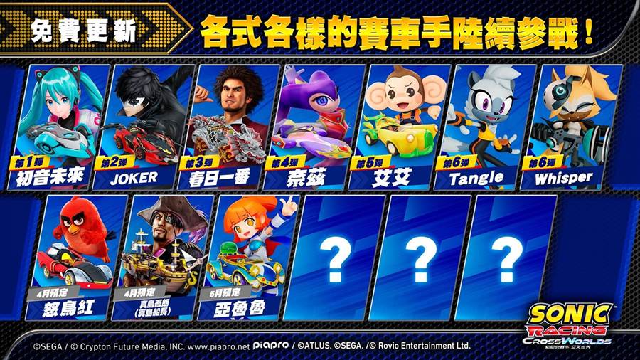 4 月預定加入來自《憤怒鳥》系列的「怒鳥紅」與來自《人中之龍》系列的「真島吾朗(真島船長)」。 5 月預定加入來自《魔法氣泡》系列的「亞魯魯」。此外,還預定追加以各作品世界觀為原型的特別賽車。