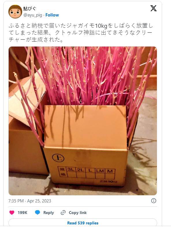 日本一名網友近日發現自己放在儲藏室的馬鈴薯,因放置太久導致完全發芽,彷彿生長在陸地上的「珊瑚礁」,妻子誤以為家中跑進神秘生物嚇一跳,令他哭笑不得。