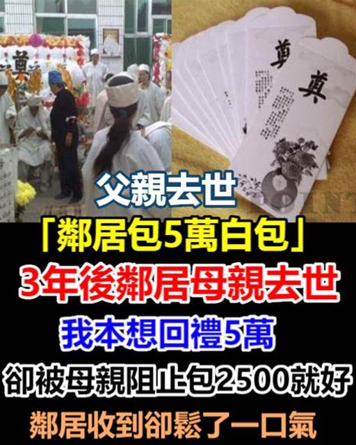 父去世「鄰居包五萬白包」 三年後鄰居母去世,我本想回禮五萬,卻被母親阻止「包2500就好」鄰居收到卻鬆了一口氣...