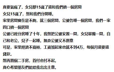 真要氣瘋了,女兒都15歲了還跟我們擠一個房間女兒15歲了,想跟我們分開睡。