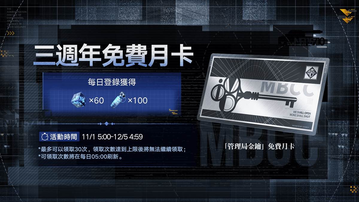 官方表示,本次三週年期間登錄將普發「免費月卡」及超過 60 抽以上的大量資源獎勵。同時,官方宣布 11/9 將于西門町舉辦「接頭派對」,以及 11/4~12/7 同步于香港、台灣展開期間限定拍貼機合作,週年活動及獎勵開跑。
