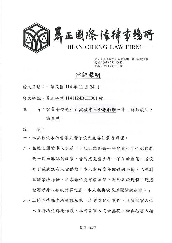 黃子佼律師宣布與被害人和解。