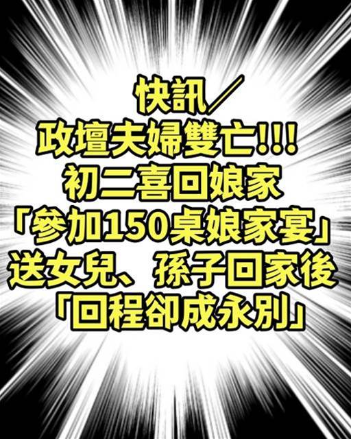 快訊/政壇夫婦雙亡!!! 初二喜回娘家「參加150桌娘家宴」送女兒、孫子回家後「回程卻成永別」