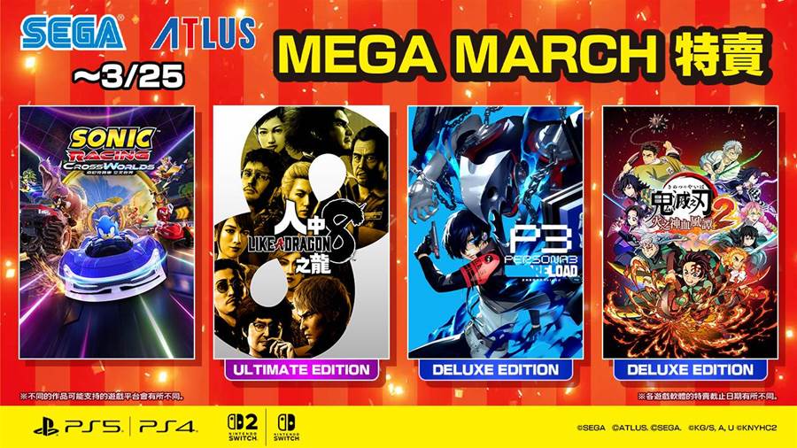 世雅股份有限公司現正舉辦「MEGA MARCH 特賣」活動。針對 PlayStation Store 及 Nintendo eShop 所販售的部分 PlayStation 5/PlayStation 4/Nintendo Switch/Nintendo Switch 2 遊戲作品送上限時特價。