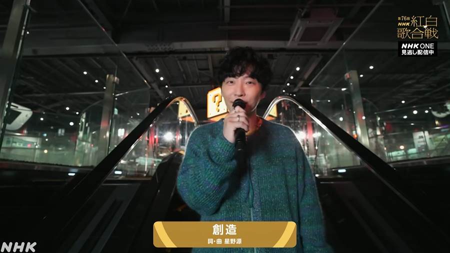 今年迎來個人出道 15 週年的星野源,此次為第 11 次登上 NHK 紅白歌合戰舞台,他以事前錄影形式演唱了收錄于專輯《Gen》、同時也是專輯製作原點之一的歌曲〈創造〉,這首歌同時也曾作為全球知名遊戲《超級瑪利歐兄弟》35 週年紀念企劃的主題曲。