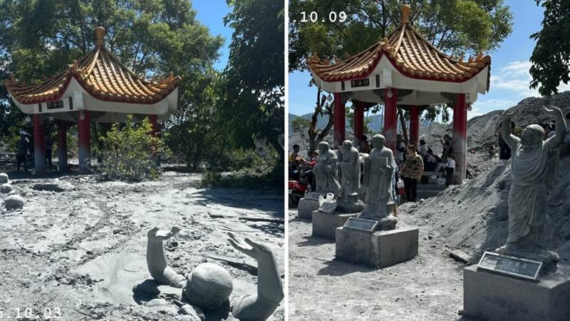 花蓮光復堰塞湖洪災後湧入大批鏟子超人清淤,讓原本被淹沒的平房、涼亭、砂石車及佛像能重見天日。