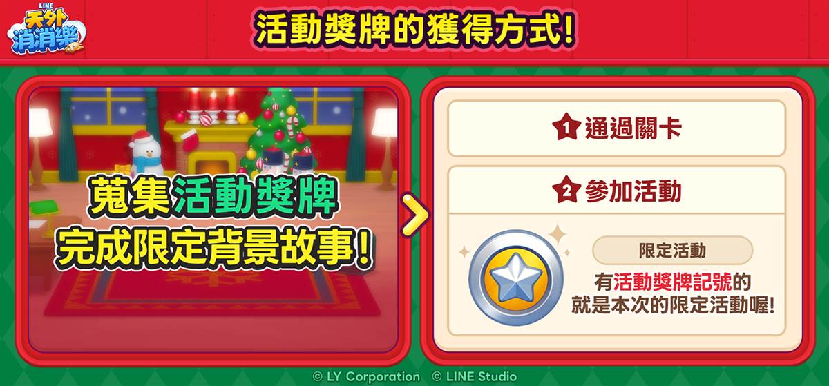 活動期間內只要通過一般關卡或完成各種活動,就有機會從活動獎勵中獲得聖誕活動獎牌。可以在裝飾商店內使用活動獎牌來交換各種可愛的活動角色與裝飾。只要將所有活動裝飾蒐集齊全,就能完成「聖誕派對」背景故事,並入手活動限定個人資訊頭像與外框喔!