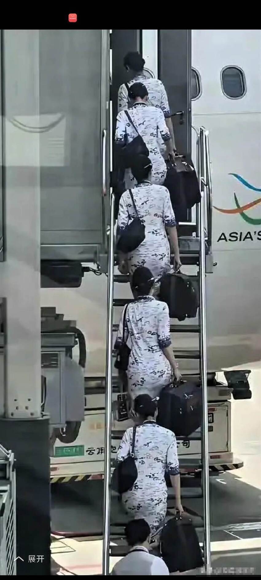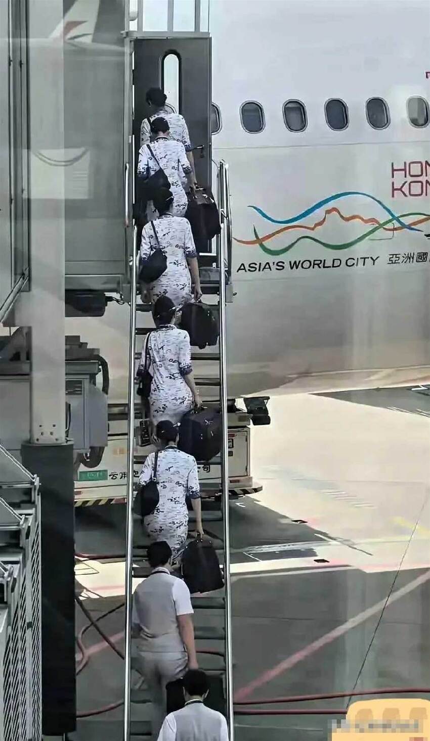 乘客們紛紛透過一架梯走向飛機,而在這片航程中,一群身著的外形空姐引人注目。