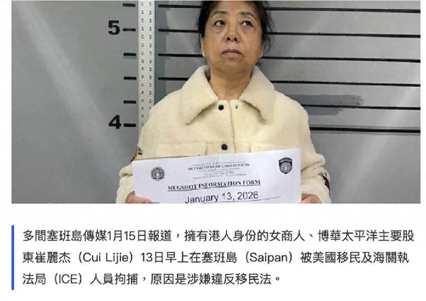 塞班島懲教署專員對媒體證實,現年68歲擁有香港人身份的崔麗傑正被關押在懲教署,因為涉及違反了移民法。