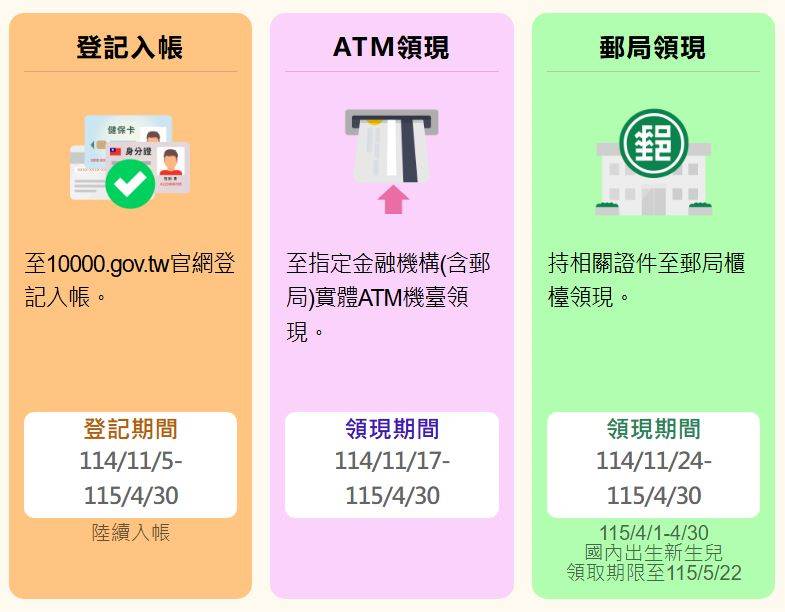 領取方式有3種:登記入賬、ATM領現、郵局領現。