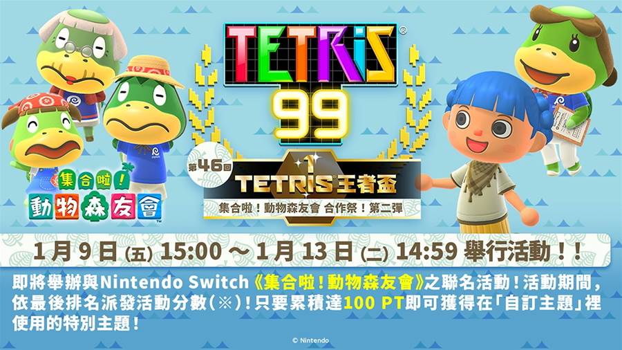 任天堂宣布,在《集合啦!動物森友會 Nintendo Switch 2 Edition》發售前,Nintendo Switch Online 加入者限定遊戲軟體《俄羅斯方塊 99(TETRIS 99)》的常規活動「TETRIS 王者盃」即將舉辦「集合啦!動物森友會 合作祭!第 2 彈」。